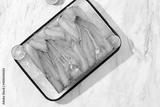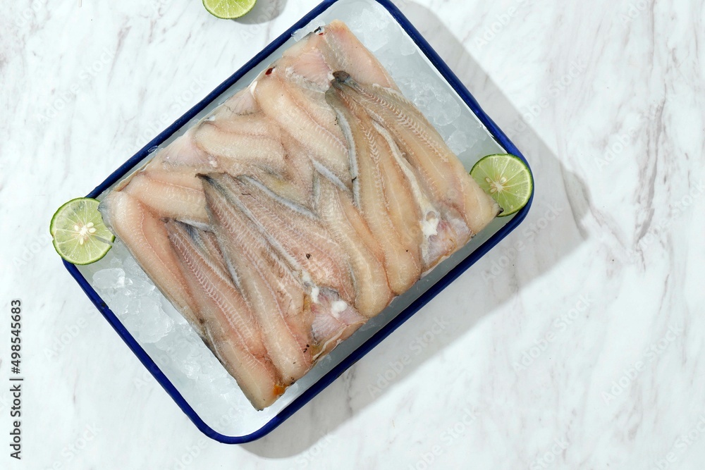 Raw fillet of white fish catfish on a cutting board. White background.