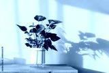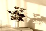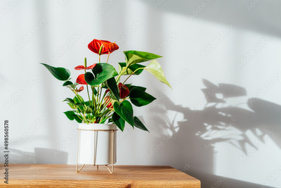 House plant red Anthurium in modern white flower pot on a wooden console under sunlight and shadows on a white gray wall. Biophilia in minimalist Scandinavian style living room design. Copy space.