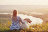 Beautiful young caucasian girl with her dog sitting on the grass on the hill at sunset. Animal, friendship, people and love concept.