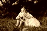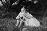 Happy woman hugging a dog in a summer park while sitting on the green grass.