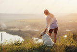 Young girl with the dog standing on a hill with view of river and sunset.