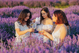 Young woman pouring white wine in glasses for the her girlfriends while sitting at picnic in the lavender field. Party on blossom lavender field. Girls hen party.
