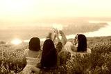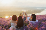 Women clink glasses with white wine at an outdoor party in the lavender field at sunset.