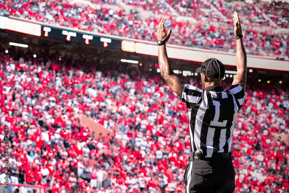 American Football Referee official signals a touchdown in a large football stadium.