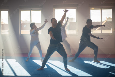 Coach showing Tai Chi exercise to students. Male trainer standing in front of senior people and moving arms at grou class. Martial art concept