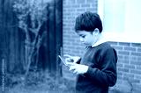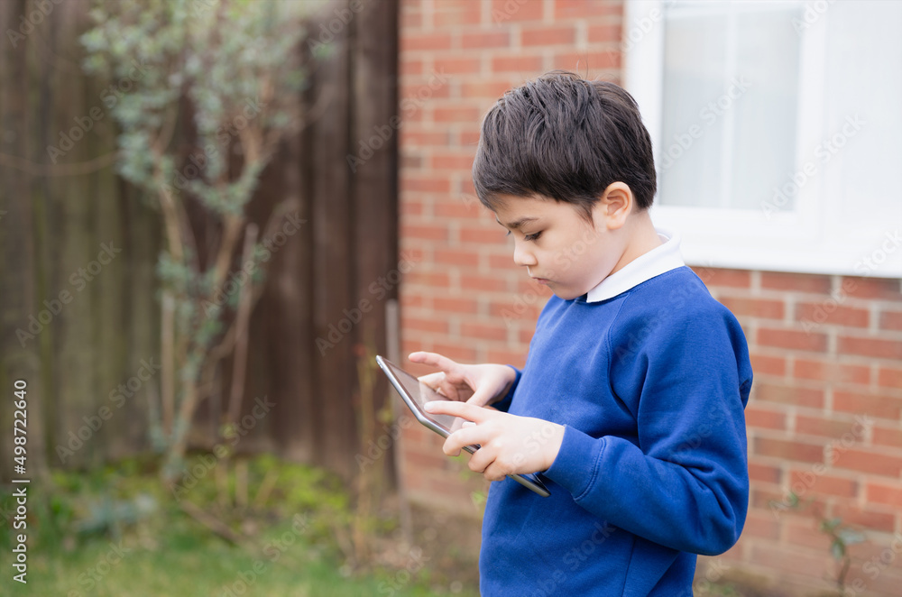 Happy Child boy holding tablet pc standing outside waiting for School bus, Portrait Kid playing game online or reading strory on internet, Preschool boy learning with modern technology