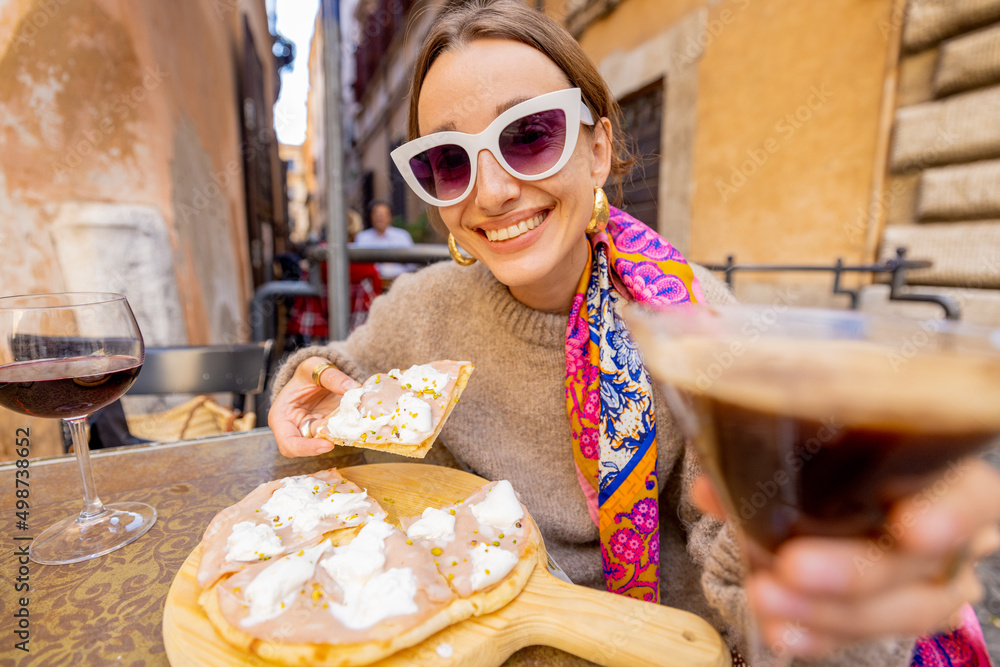 Woman having fun while eating pizza and drinking cocktail at restaurant on a street in Rome. Concept of Italian gastronomy and travel. Stylish woman with sunglasses and colorful hair shawl