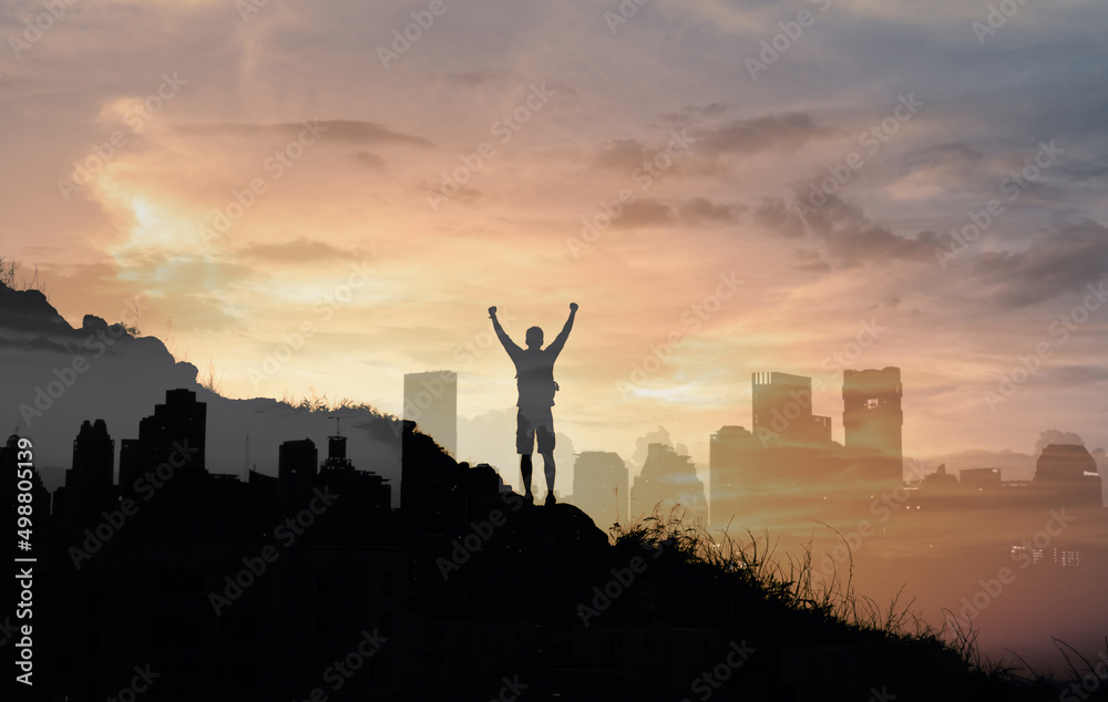 People in the city reaching goals. Man celebrating victory on a mountain top. Nature getaway.