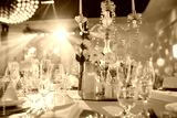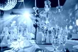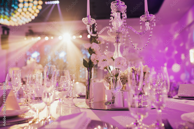 Served table for wedding ceremony, decoration with candles and flowers in the luxury restaurant.