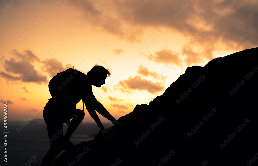 Man climbing up mountain cliff. will power, and taking risk concept.