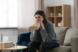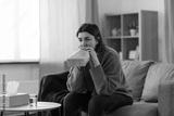 mental health and psychological problem concept - woman having panic attack breathing to bag at home