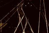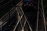 Railway tracks and locomotive of a freight train evening twilight dusk seen from a pedestrian Bridge in Hagen Hohenlimburg Germany. Shiny glistening lines of steel rails with interchange junction.
