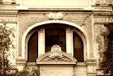 An old abandoned building. Close-up decorative element. Merchant Firsov's Passage, Biysk, Russia.