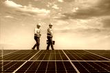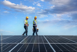 Engineers walking on roof inspect and check solar cell panel by hold equipment box and radio communication ,solar cell is smart grid ecology energy sunlight alternative power factory concept