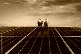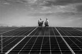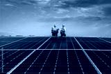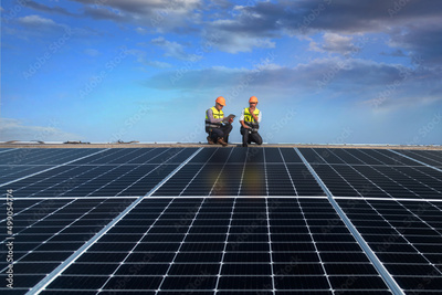 Engineers walking on roof inspect and check solar cell panel by hold equipment box and radio communication ,solar cell is smart grid ecology energy sunlight alternative power factory concept