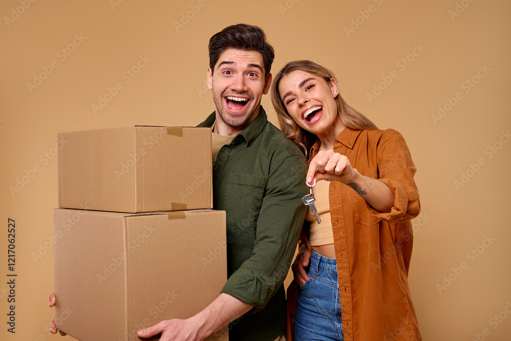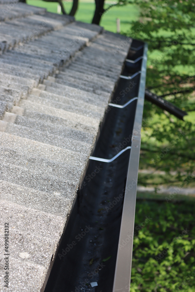Detail of home roof with dark brown metal rain gutter. House roof covered by gray cement roofing tiles
