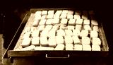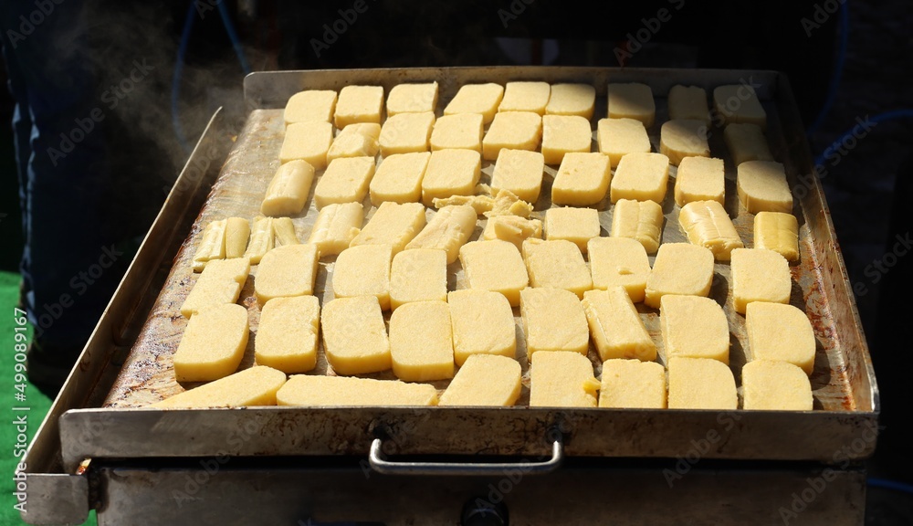 Slices of Polenta, traditional north italian dish cornmeal based, baked on a grill.