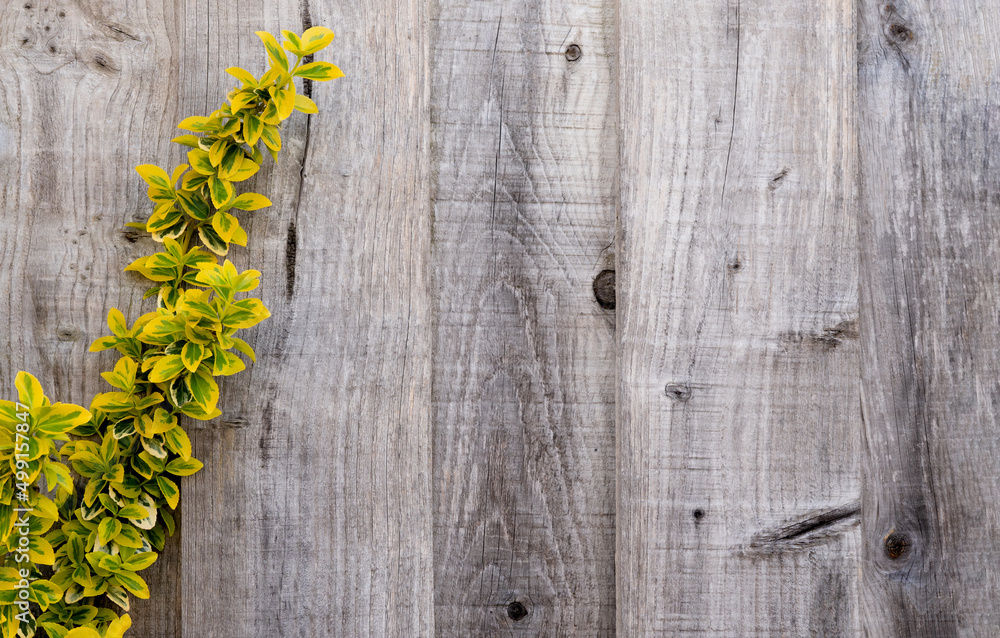 Wooden fence with yellow leaves in garden, Climber with yellow and green leaves on a wooden wall with copy space on background, Natural Leaves on rustic wood background.
