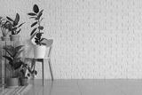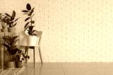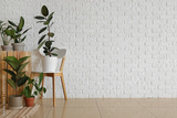 Beautiful houseplants and chair near white brick wall