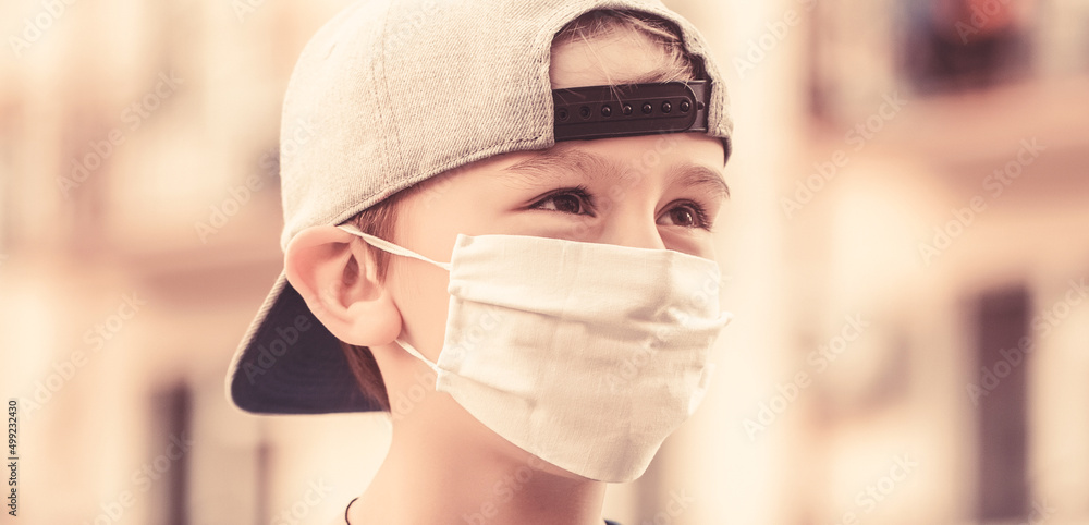 Coronavirus epidemic. Boy with protection facemask. Coronavirus quarantine. Health care. Face mask for protection coronavirus outbreak. Child wearing a medicine mask outdoors