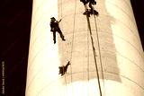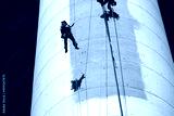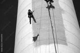 Two industrial climbers roping from chimney and cleaning graffiti vandalism with special equipment on a sunny spring day. Photo taken April 6th, 2022, Zurich, Switzerland.