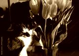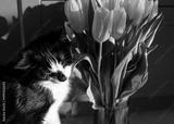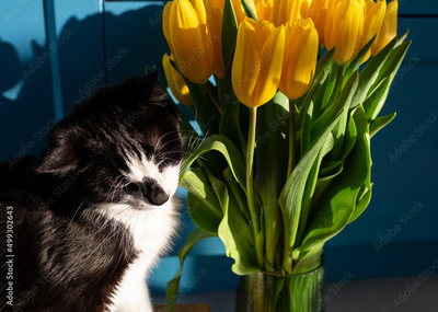 The cat is sitting near a glass vase with yellow tulips.