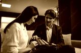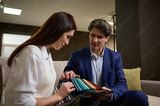A consultant in a furniture store shows a beautiful woman samples of colors and textures of fabrics for upholstery of soft furniture.