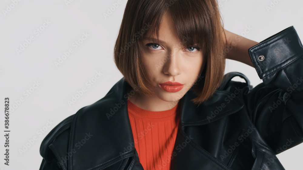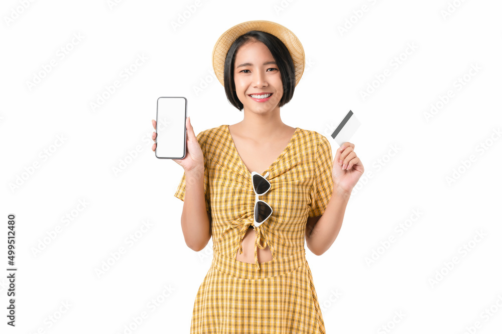 Cheerful beautiful Asian woman holding smartphone and mockup credit card on white background.