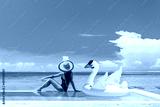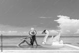 Luxury swimming pool vacation travel lady sun tanning relaxing on infinity ocean waterfront resort with floating white swan inflatable toy float banner panoramic summer background
