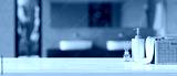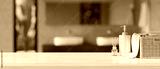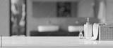White tabletop with copy space against blurred modern comfortable bathroom interior
