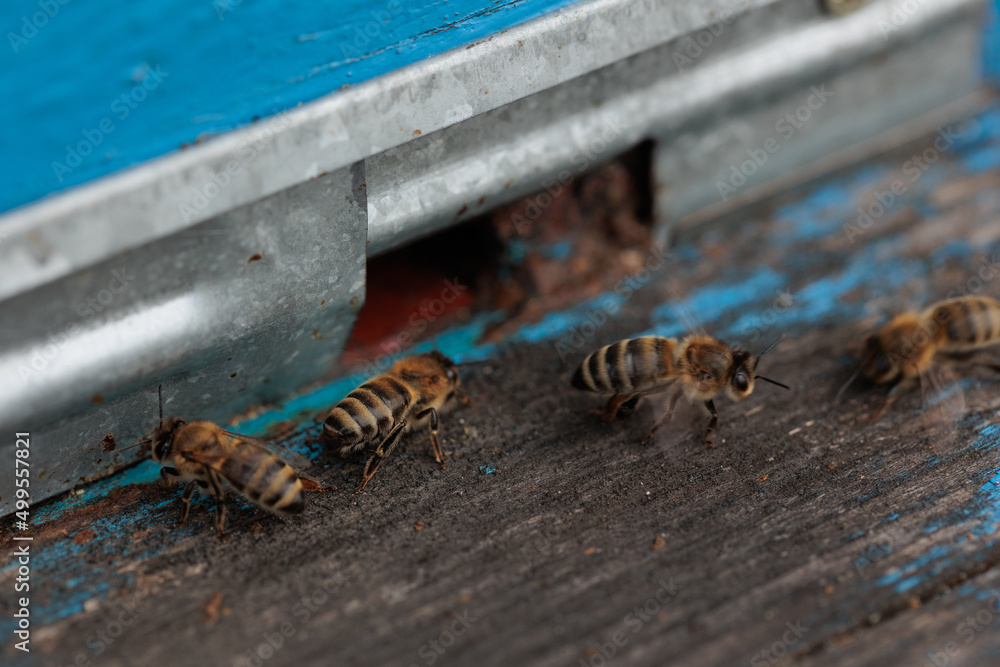 detailed view of working bees in a bee hive. Wooden beehive and bees. bees flying back in hive