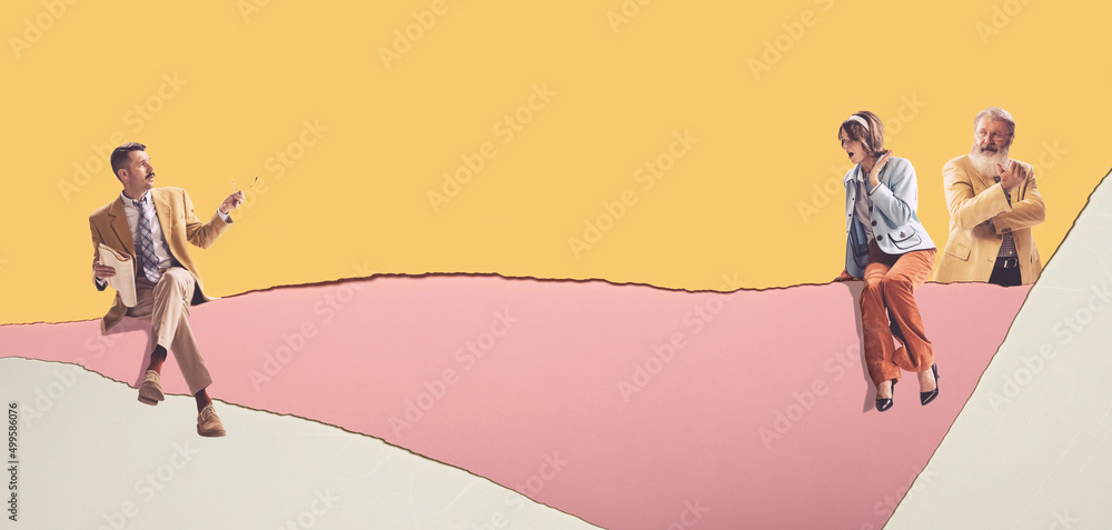Contemporary art collage of man sitting on edge of a torn sheet of paper talking with young woman and old man isolated over pink background