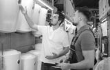 Home appliances. Man on advice of seller chooses new heating water boiler in building materials store. Salesman in overalls advises customer on characteristics of modern thermodynamic water heaters.