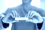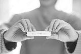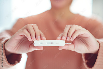 Woman looking at test and showing negative results on test strip, Coronavirus pandemic protection. Female using rapid antigen test kit for self test covid-19 epidemic at home.