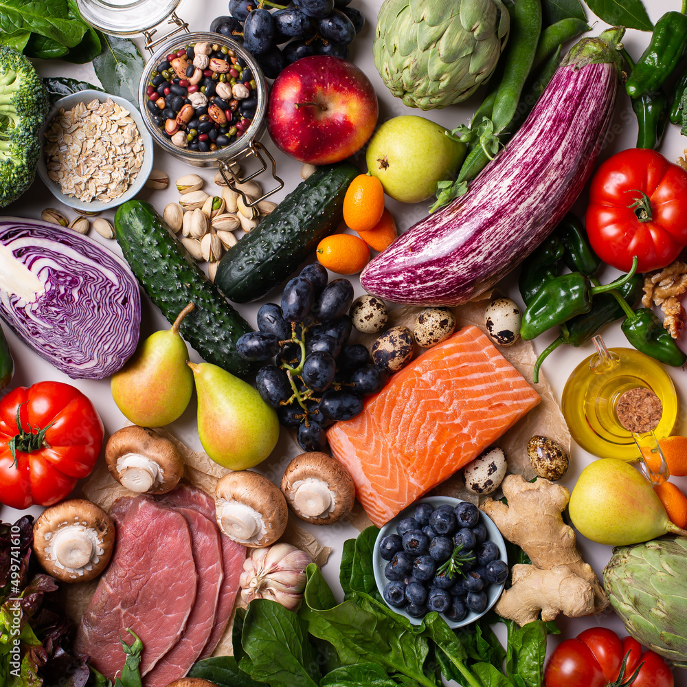 Assortment of healthy food for clean eating flexitarian mediterranean diet
