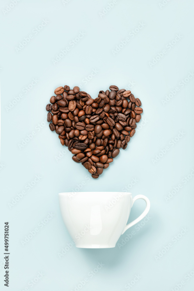 White coffee cup and coffee beans in shape of heart on blue background, flat lay