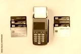Stack of credit cards and card reader machine with invoice bill on yellow background. Online payment concept.