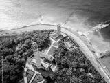 Aerial drone shot of the Phare des Baleines or Lighthouse of the Whales at sunset and sea view on Ile de Ré or island of Re France