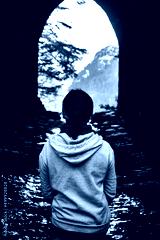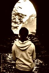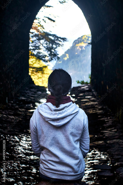 mujer joven con sudadera gris y ropa casual sentada frente a un tunel y un bosque en el fondo en mexiquillo durango