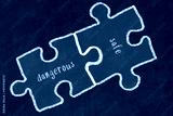 Ploblem solving. Chalk sketch of two puzzles with words dangerous and safe