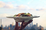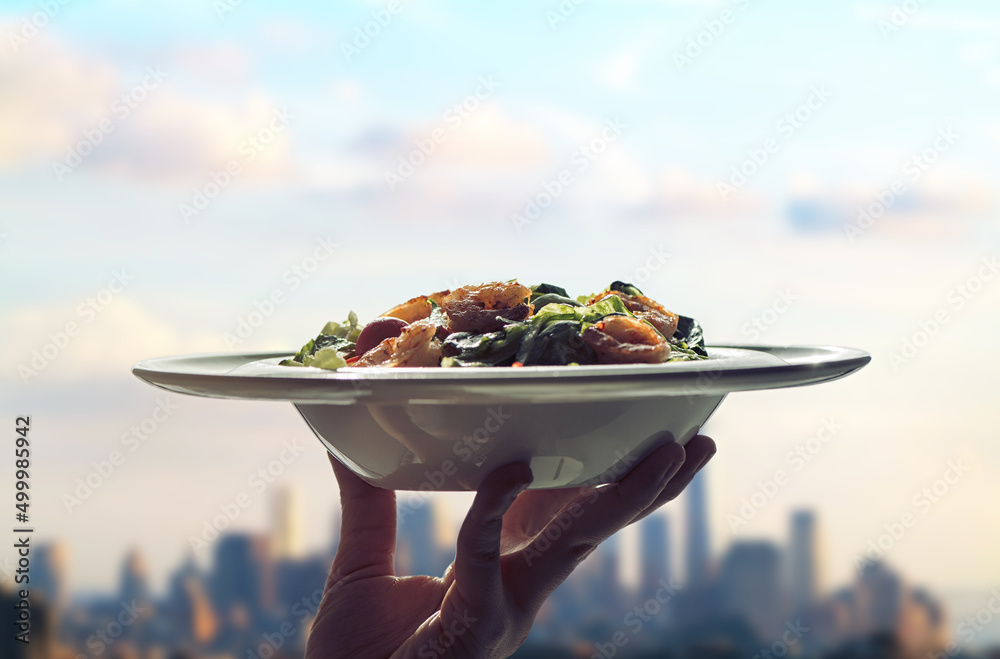 Waitress woman hand with plate of salad on skyscrapers of New York city background. View from roof of restaurant