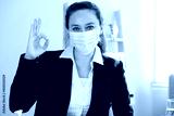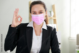 Business woman with face mask gesturing ok sign avoiding coronavirus at home office
