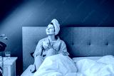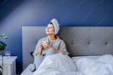 Woman in pajama and bathrobe with eyes patches and towel on her head relaxing and drinking morning coffee while sitting on her bed. Morning habits and home beauty routine. Self care. Selective focus