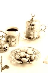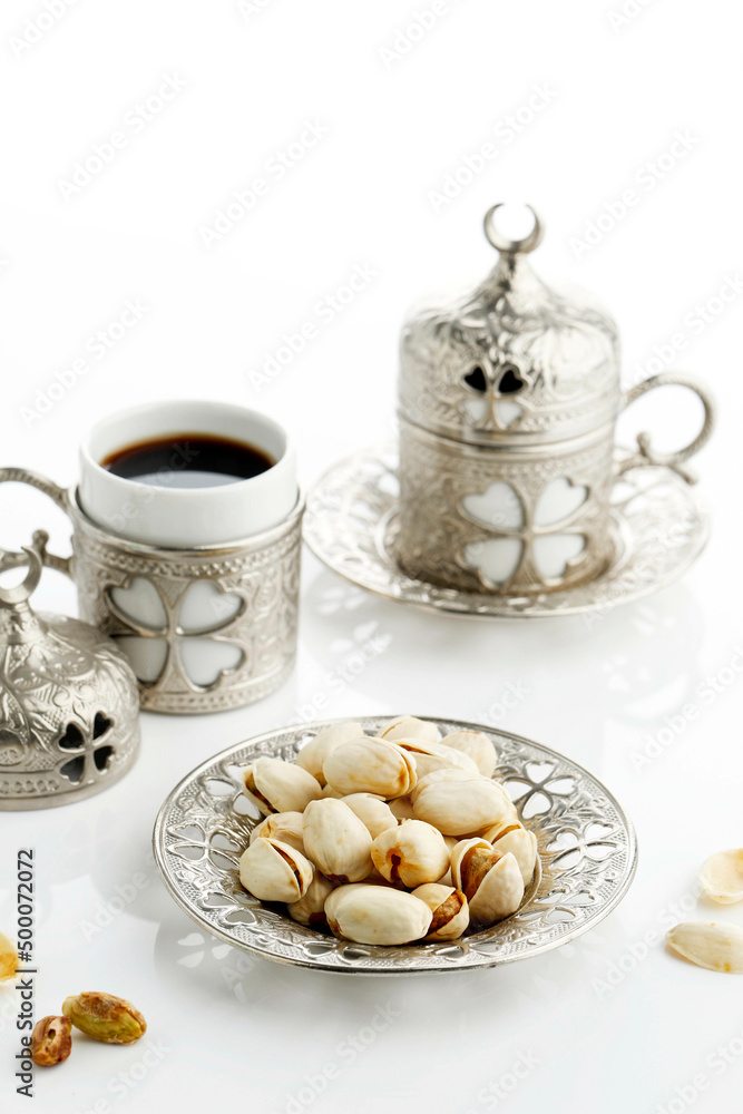 Roasted Pistachio Nuts Served with Turkish Tea or Coffee, on WHite Background