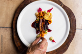 Chef's hand detail shot of crafting fine dining appetizer at restaurant