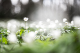 White wood anemone flowers in spring forest closeup. Forest meadow covered by Primerose (Nemorosa) flowers
