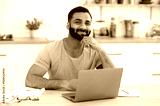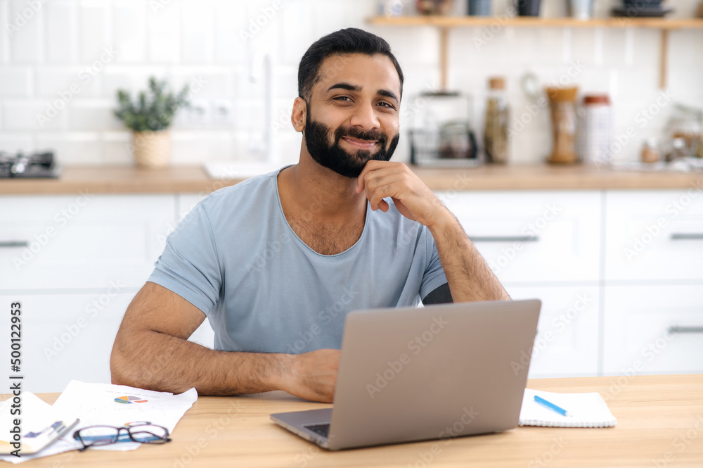 Portrait of handsome positive young adult Indian or Arabian man, freelancer, designer or IT specialist, sit in the kitchen, works from home using laptop, looking directly into camera, smiling friendly