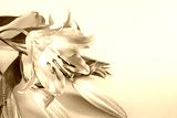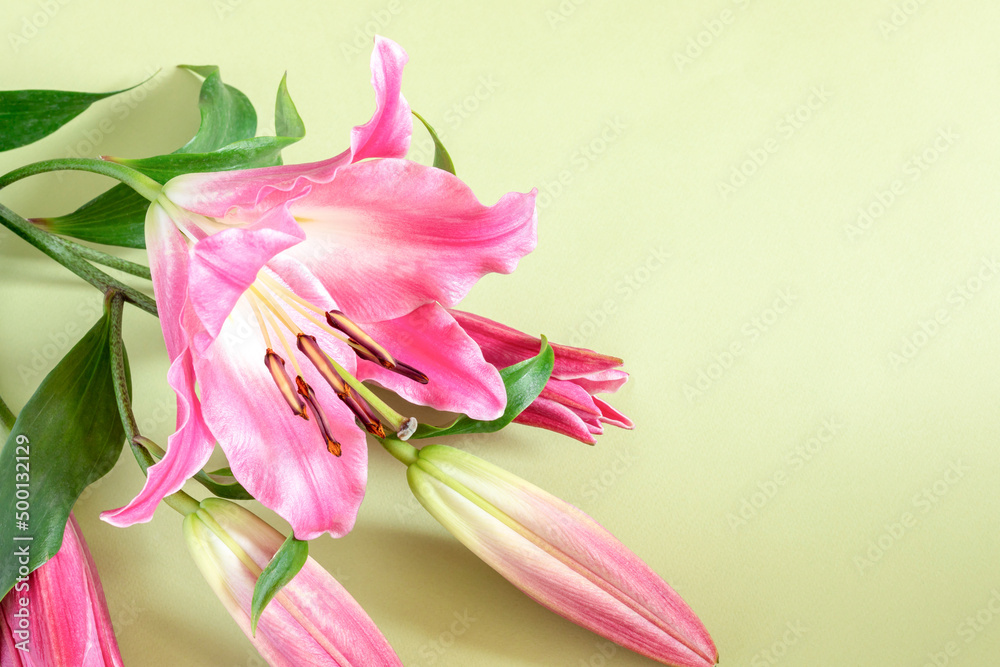 Close-up of pink lily flower on light green background for design on the theme of wedding or holiday invitation