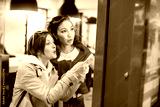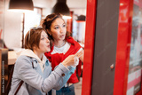Two girl friends orders food and lunch at a fast food restaurant using a self-service kiosk or a terminal with a screen. Modern commerce equipment