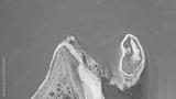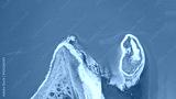 Flying over a pink salt lake. Salt production facilities saline evaporation pond fields in the salty lake. Dunaliella salina impart a red, pink water in mineral lake with dry cristallized salty coast.